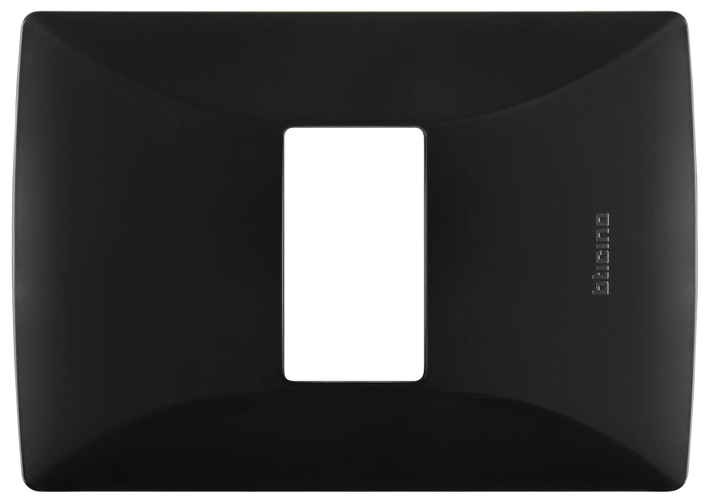 Placa de 1 módulo de resina color Negro Mate. Incluye chasis. Código QZ4803M1NB de la línea de producto Quinziño MX de la marca Bticino. Fabricada en resina ABS autoextinguible y resistente a impactos, chasis de polipropileno.